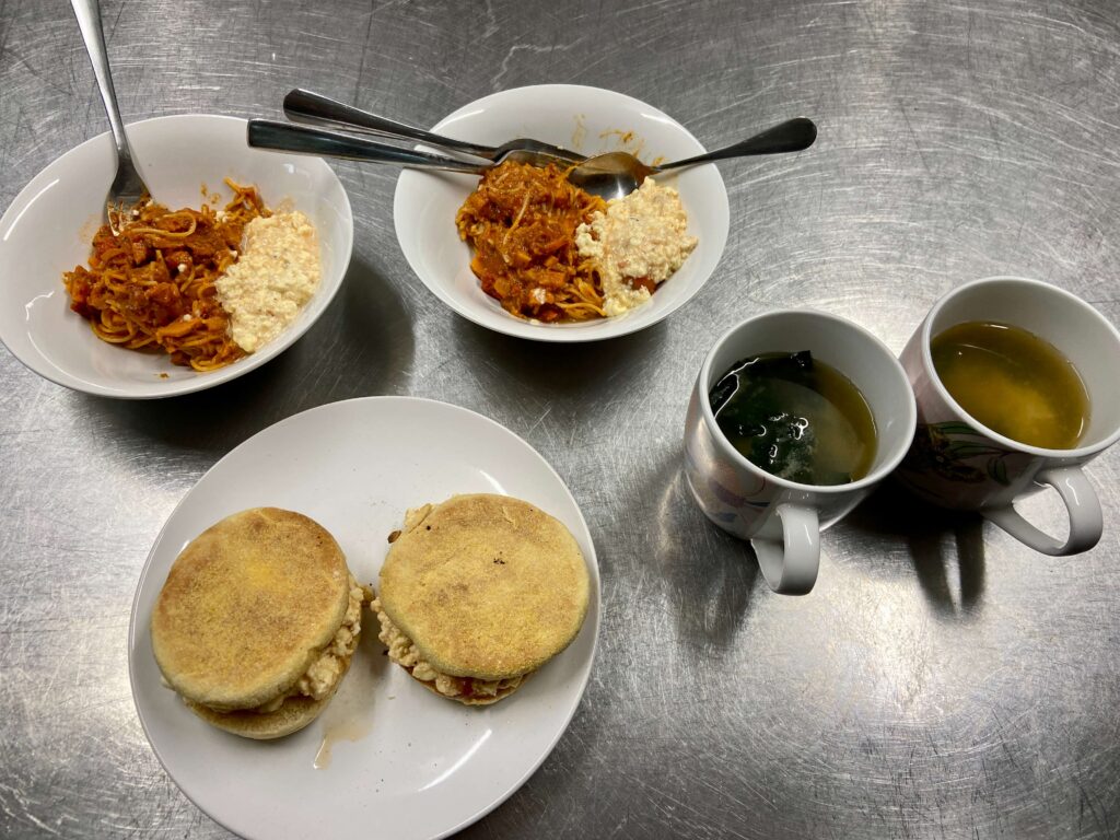 つーわけで我々が今夜いただく(ことができる)のは、プロテイン、昨日作ってきた簡易イングリッシュマフィンサンドイッチ、インスタント味噌汁、赤だしです。泣